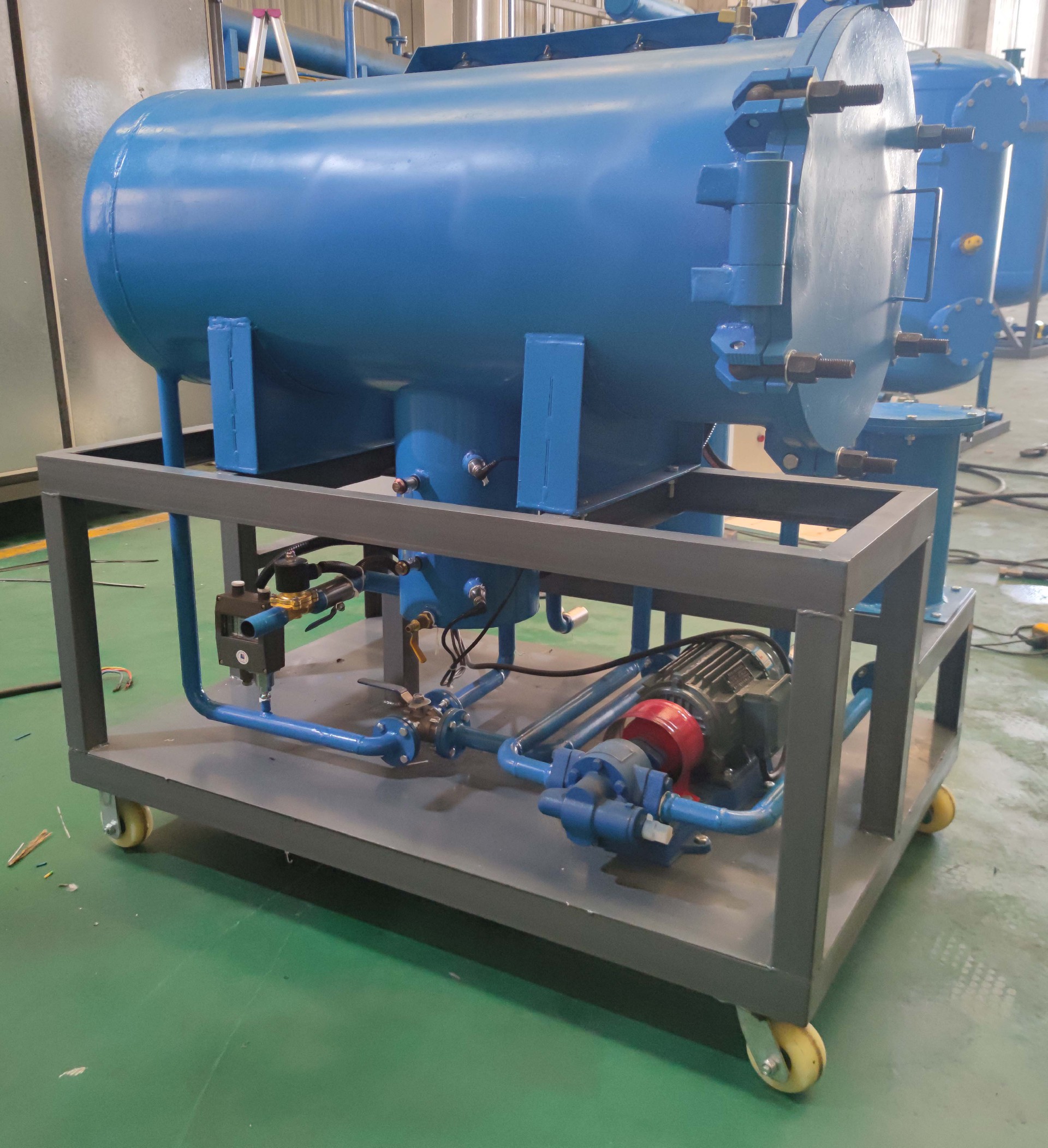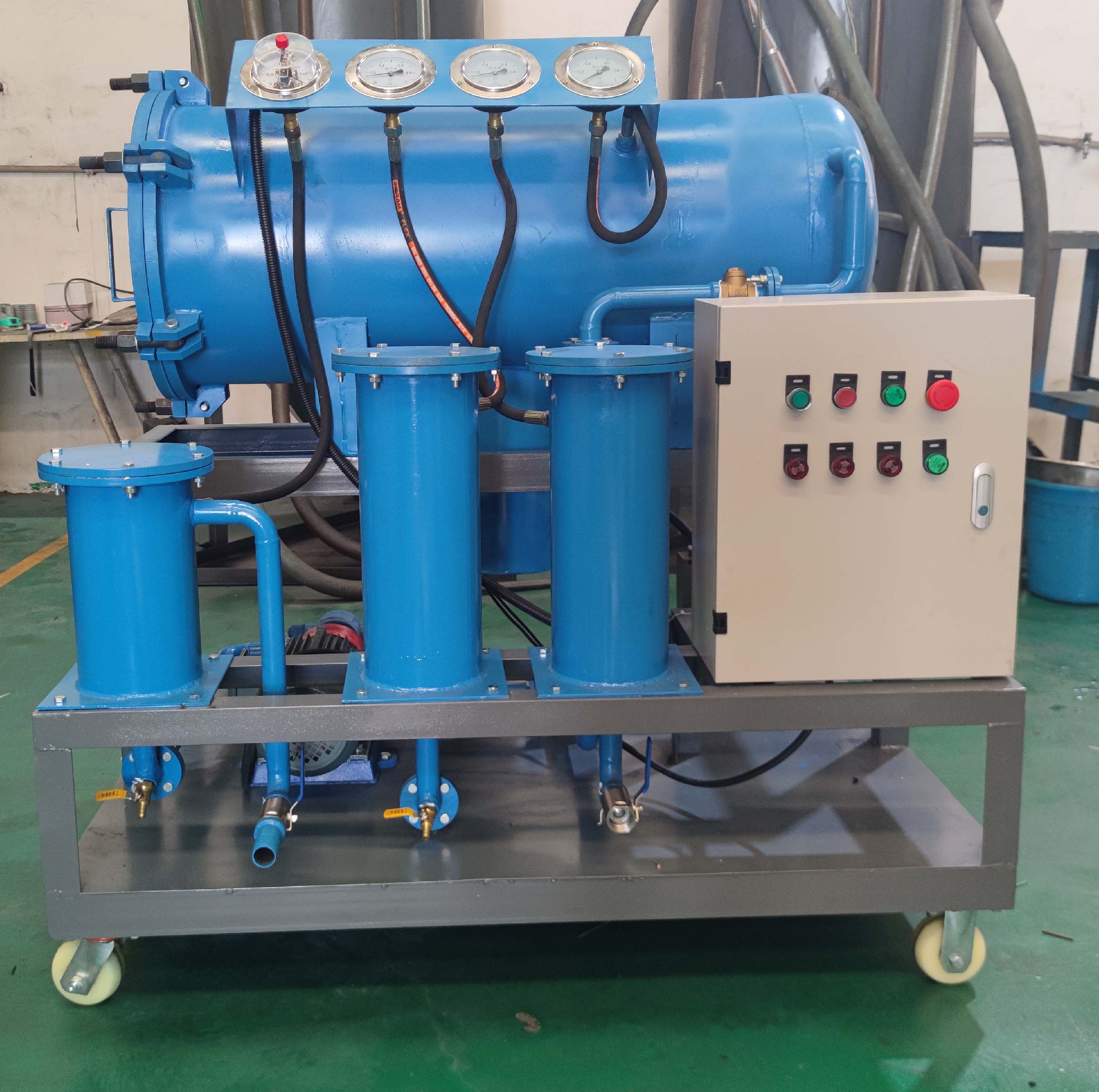 TJ系列聚結(jié)分離式濾油機(jī)采用先進(jìn)的聚結(jié)分離材料作為介質(zhì),集破乳化和精密過濾為一體。結(jié)合特制的油水分離裝置,能有效分離油中水分,脫水效率極高??蓪\(yùn)行中的汽輪機(jī)組進(jìn)行透平油的在線破乳化,脫水,除雜處理,同時(shí)也可以對含水量高的輕質(zhì)油進(jìn)行脫水,除雜處理。本機(jī)運(yùn)行時(shí)無須加熱和抽真空,耗能低,運(yùn)行成本低。采用手推車結(jié)構(gòu),輕巧靈活,使用方便。