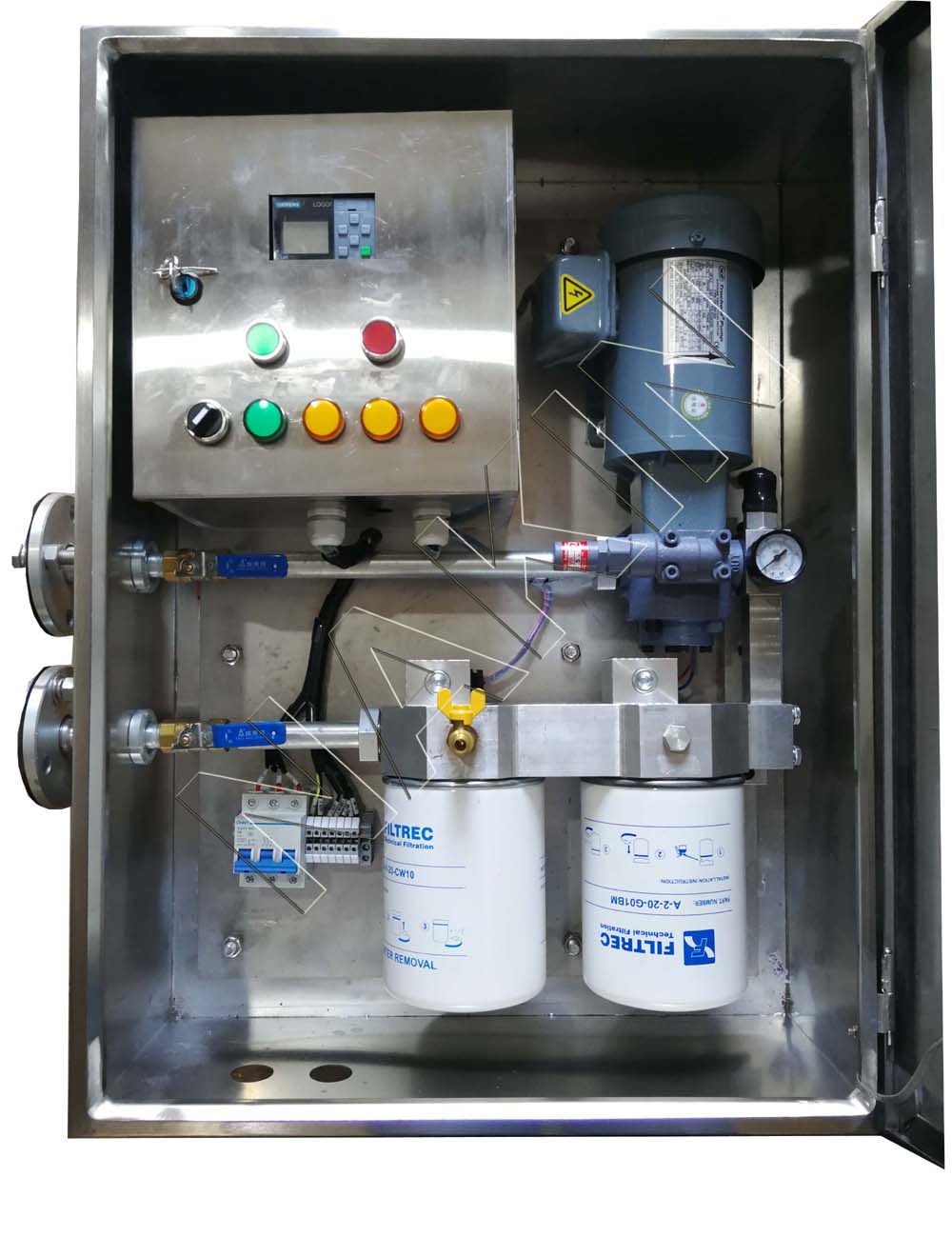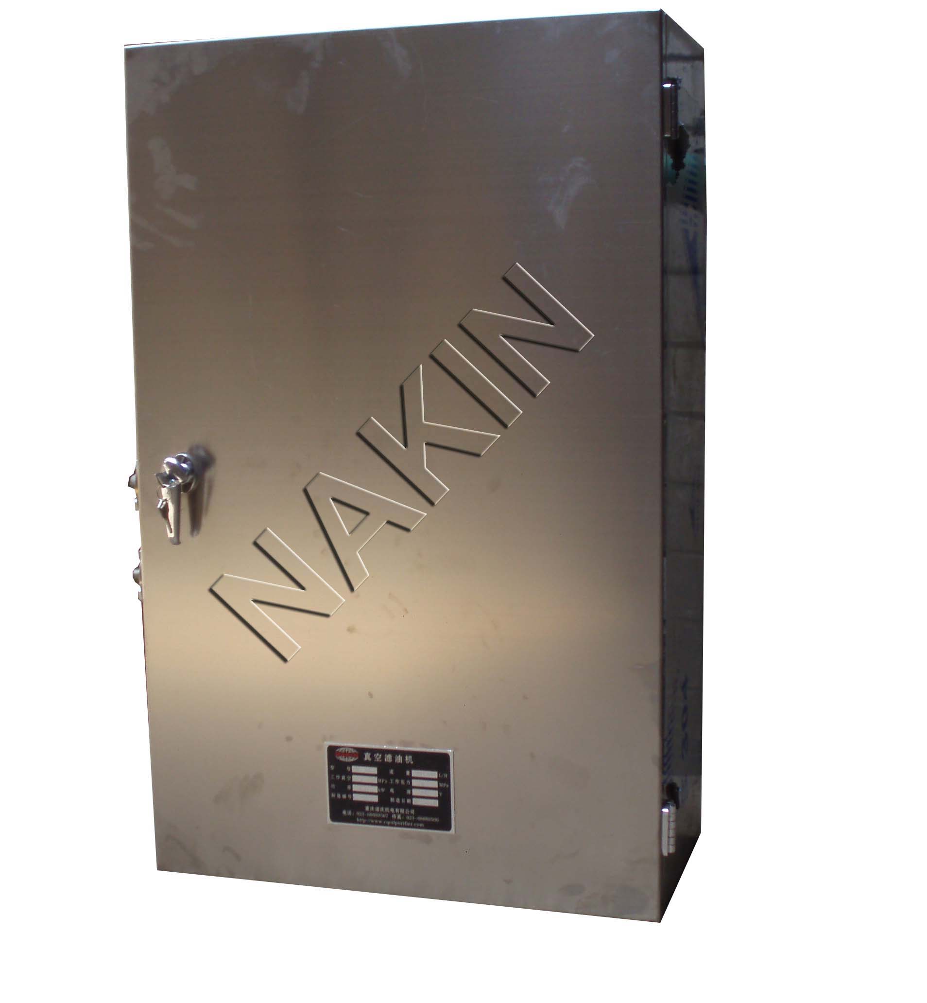 本裝置由濾芯、油泵、管路、控制、箱體等五大部分組成。其中濾芯分為除雜濾芯與除水濾芯倆種:除雜濾芯用于吸附游離碳和劣化雜質(zhì)等,除水濾芯用于去除水分。變壓器有載開關(guān)在線凈油器符合《電力變壓器運(yùn)行規(guī)程》(DL/T572-95)規(guī)范要求。